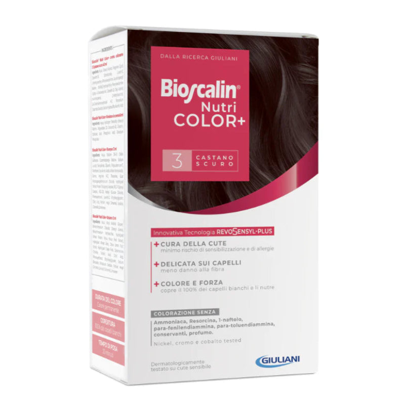 Bioscalin Nutricolor+ Kit Coloração 3 Castanho Escuro foi concebida para oferecer uma cor intensa, duradoura e com cobertura total dos cabelos brancos.